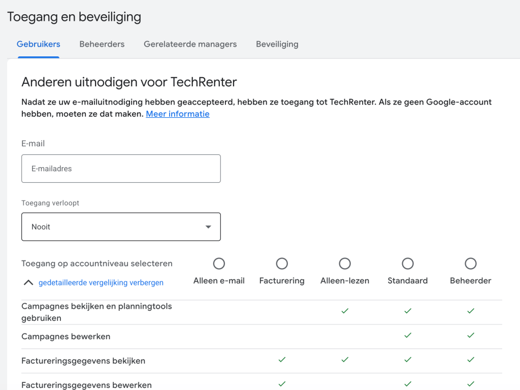 Google Ads biedt verschillende toegangsniveaus:
